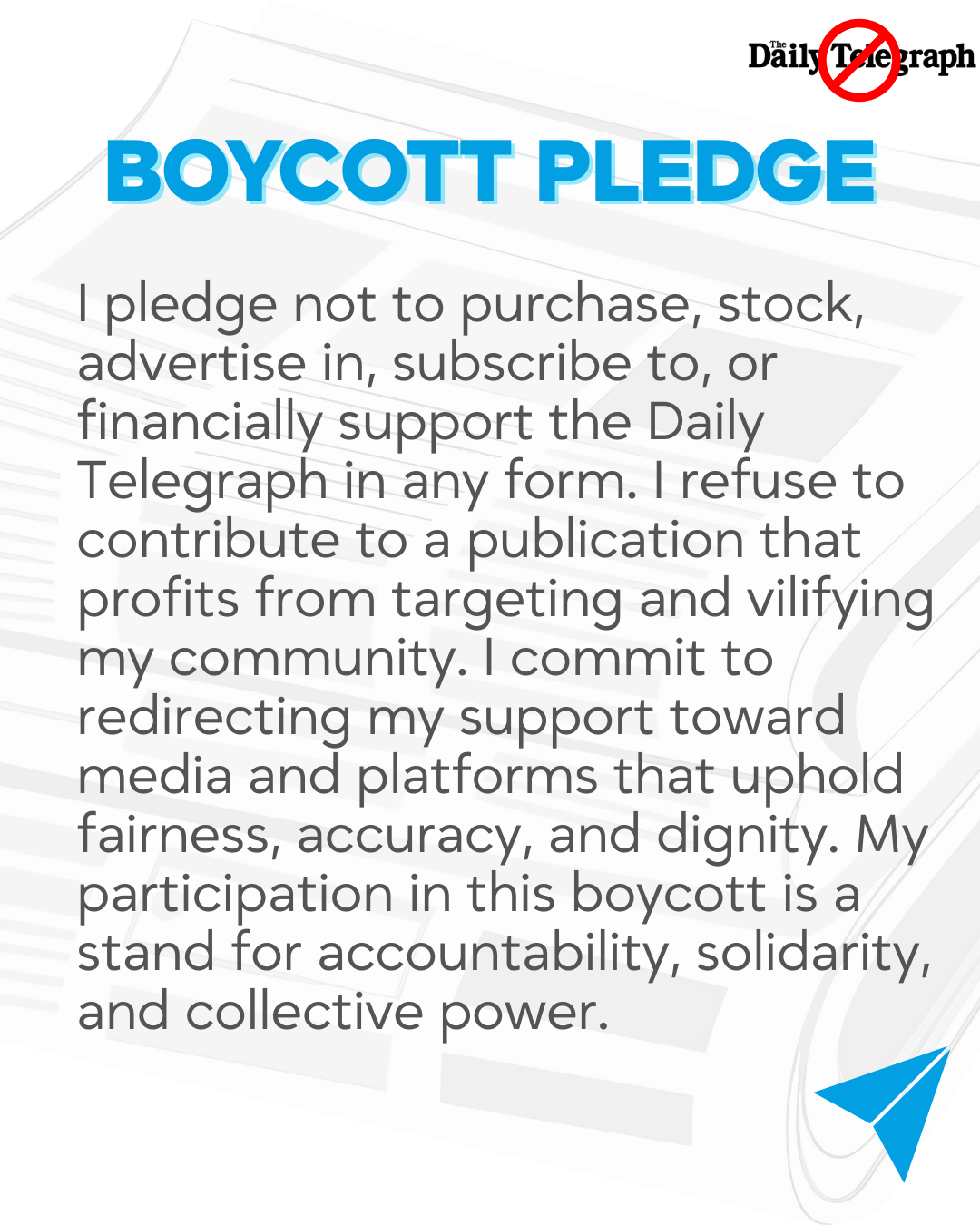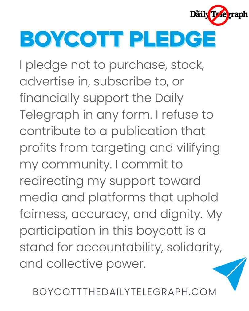 I pledge not to purchase, stock, advertise in, subscribe to, or financially support the Daily Telegraph in any form. I refuse to contribute to a publication that profits from targeting and vilifying my community. I commit to redirecting my support toward media and platforms that uphold fairness, accuracy, and dignity. My participation in this boycott is a stand for accountability, solidarity, and collective power.